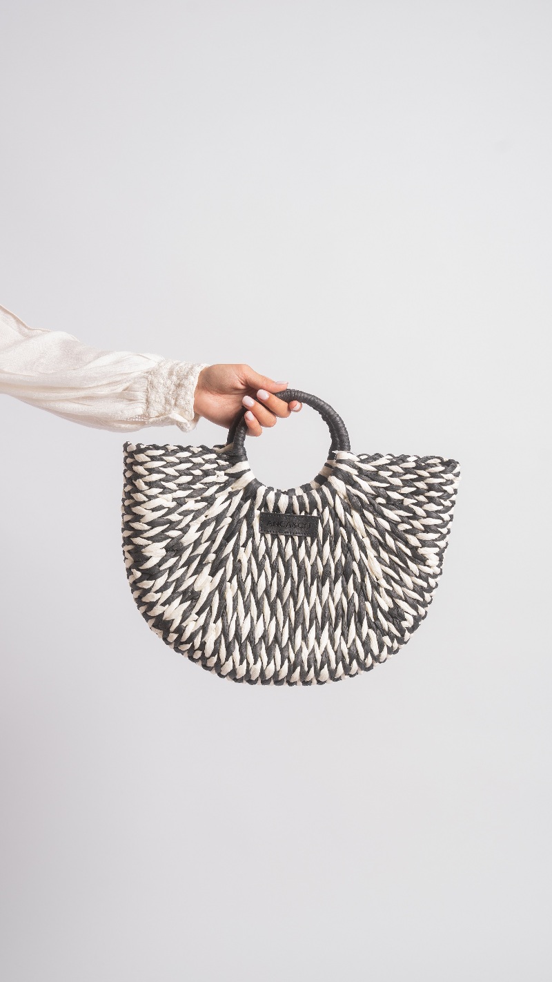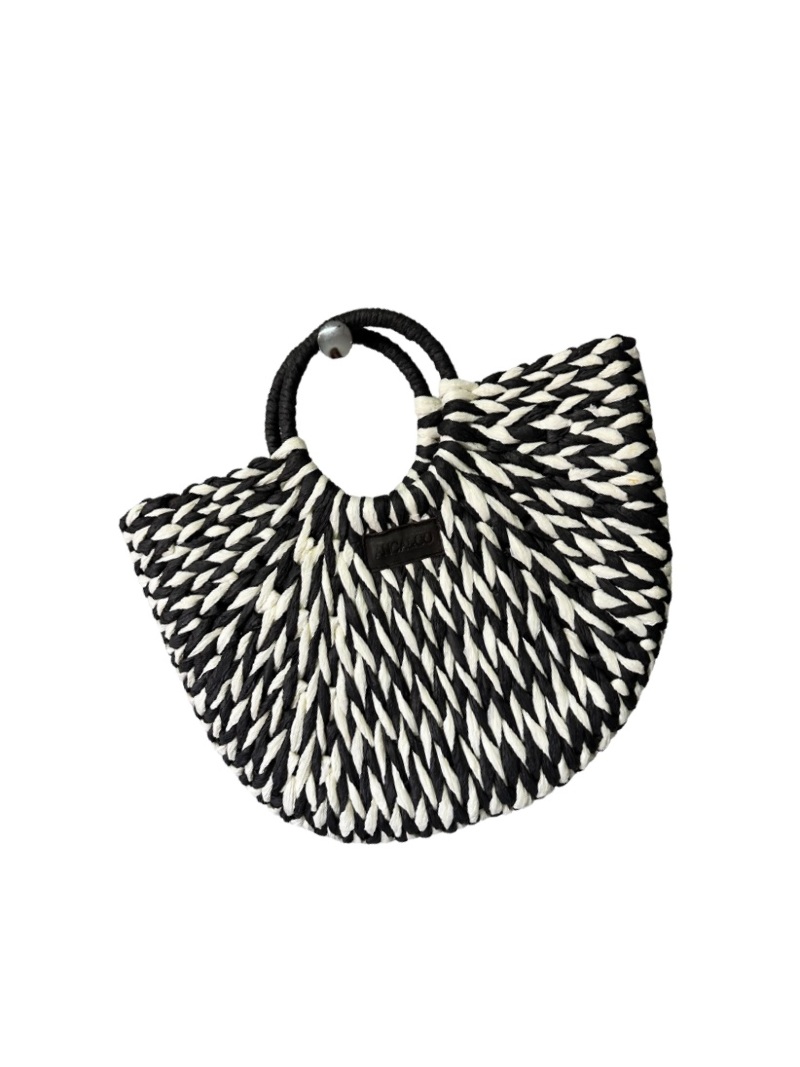 Contraste intenso en blanco y negro para un look moderno y sofisticado. Tejido a mano, cuentan con asas redondas forradas y una estructura firme que mantiene la forma. Ideal para llevar lo esencial con estilo, ya sea en la ciudad o en la playa. Medidas aprox.: 38 cm x 26 cm. Liviano, resistente y con etiqueta de cuero grabada.
