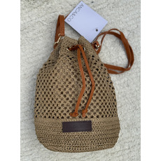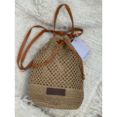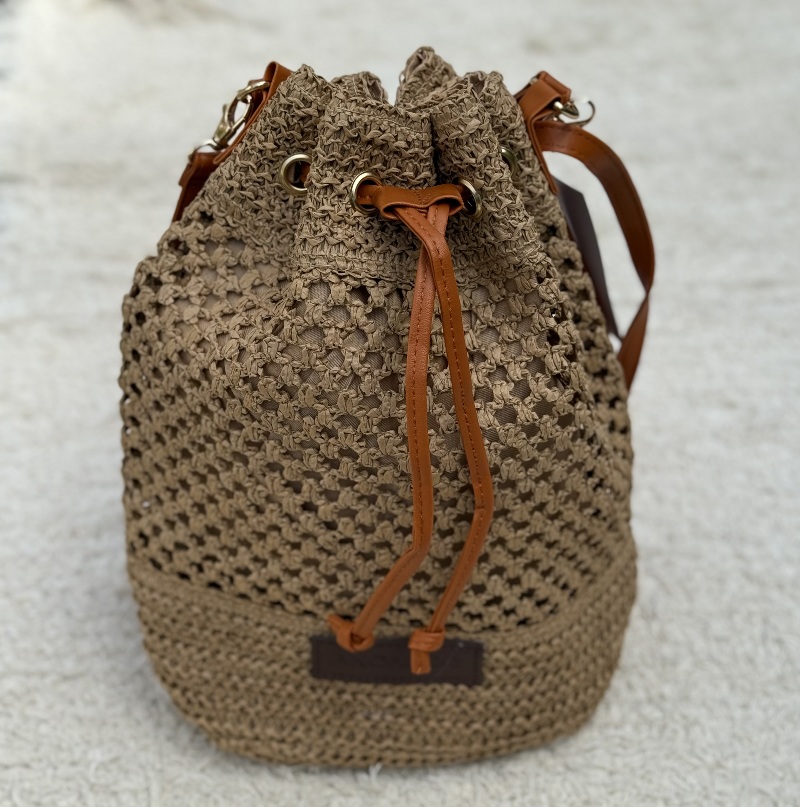 Cartera artesanal ANCA&CO estilo crochet, forrada textil, cierre con cordón, bolsillo interno. Medidas: 30x28 cm.