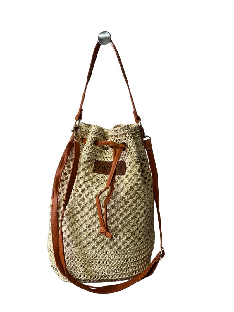 Cartera artesanal ANCA&CO estilo crochet, forrada textil, cierre con cordón, bolsillo interno. Medidas: 30x28 cm.