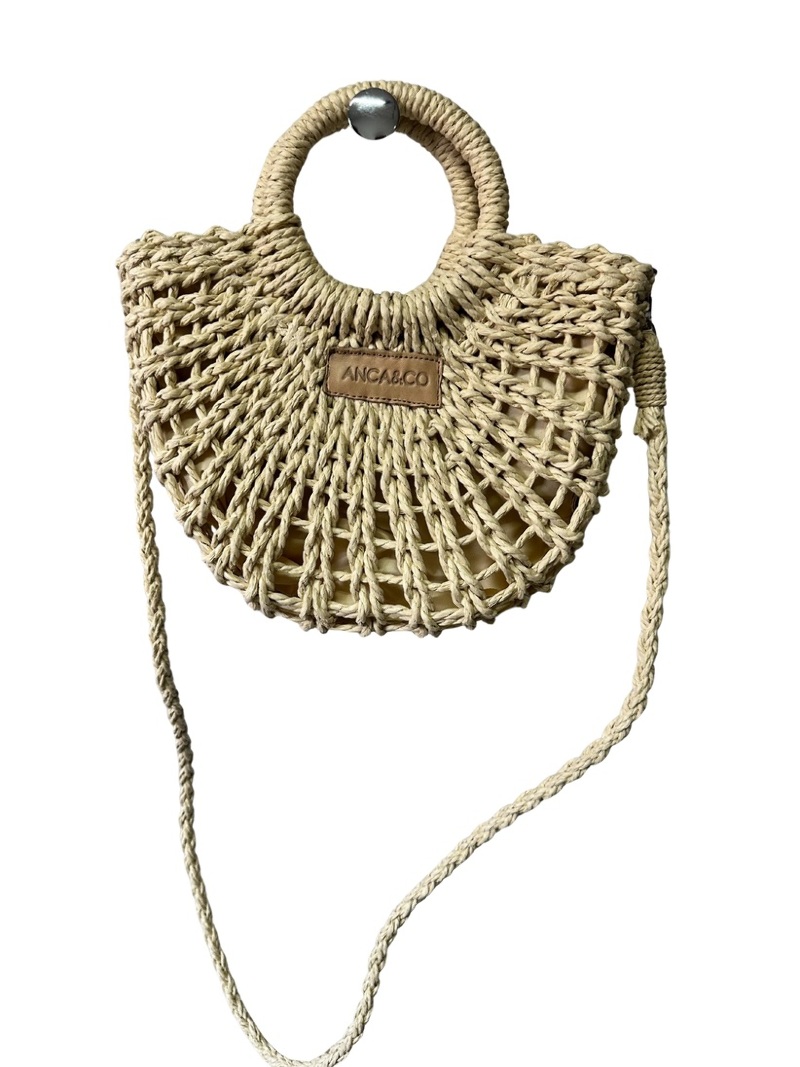 Cartera de rafia ANCA&CO. Diseño tipo abanico tejido a mano en rafia natural. Asa circular y correa larga trenzada. Liviana, original y perfecta para looks veraniegos. Medidas: 26 cm x 20 cm