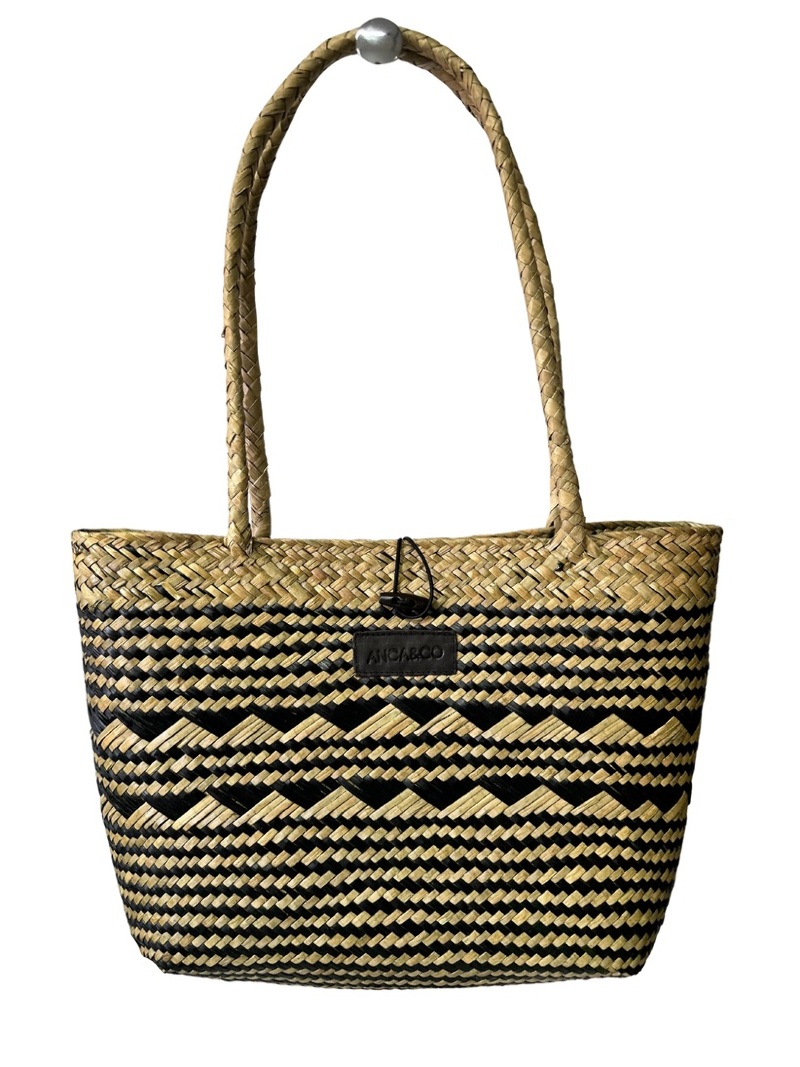 Bolso artesanal en palma trenzada con diseño geométrico en tonos negro y natural. Amplia, liviana y con manijas largas para llevar al hombro. Estilo boho con impronta étnica. Cierre con broche pasador.