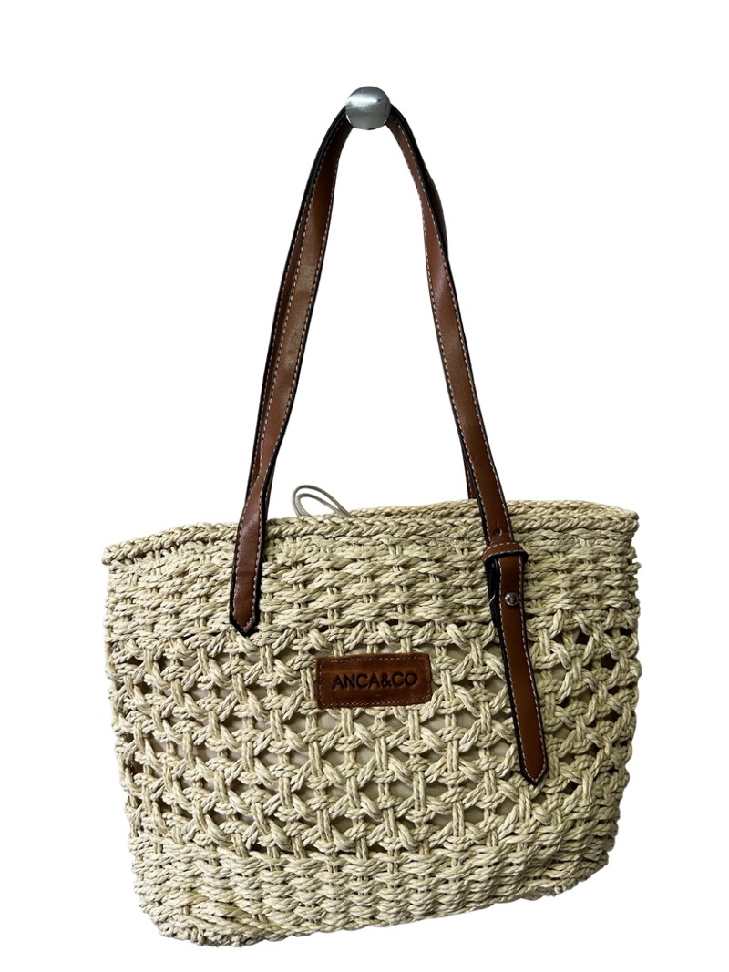 Cartera ANCA&CO calada. Medidas aprox.: 33 x 25 cm. Tejido calado artesanal, liviana y con estilo veraniego. Manijas de eco-cuero marrón con hebilla decorativa. Forrada, con cierre y bolsillo interno. Compacta, fresca y muy canchera.