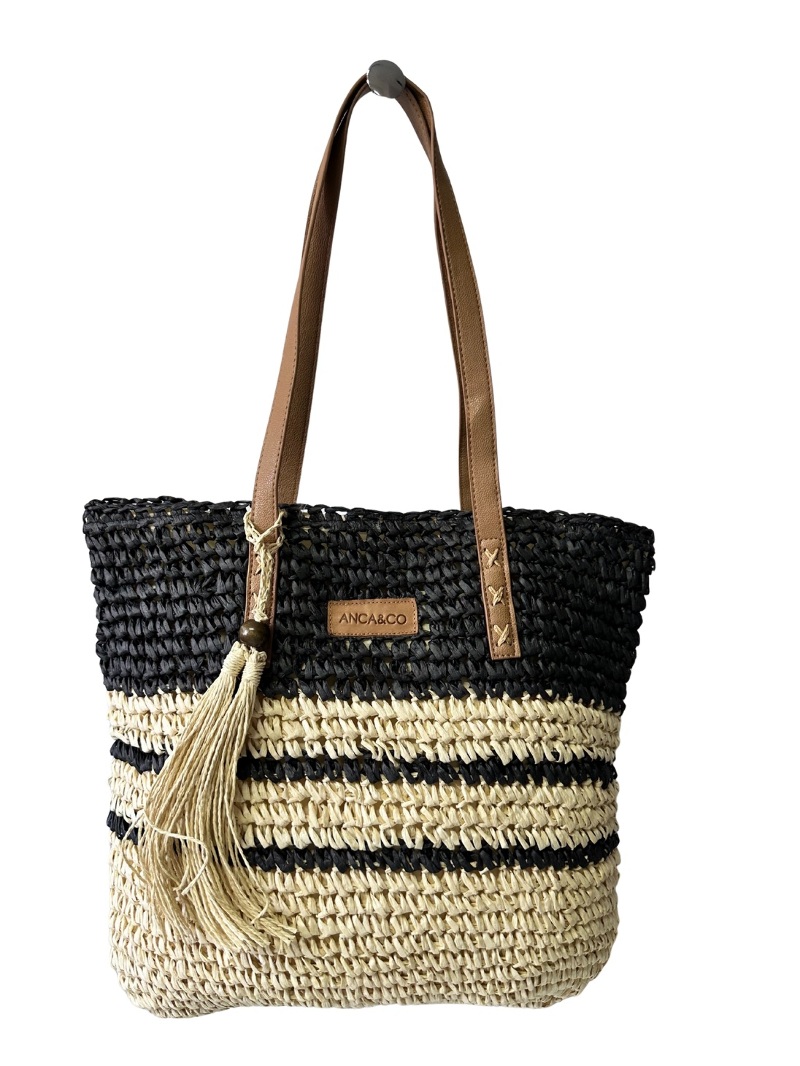 Cartera tejida, confeccionada en fibras naturales con diseño bicolor negro y crudo.