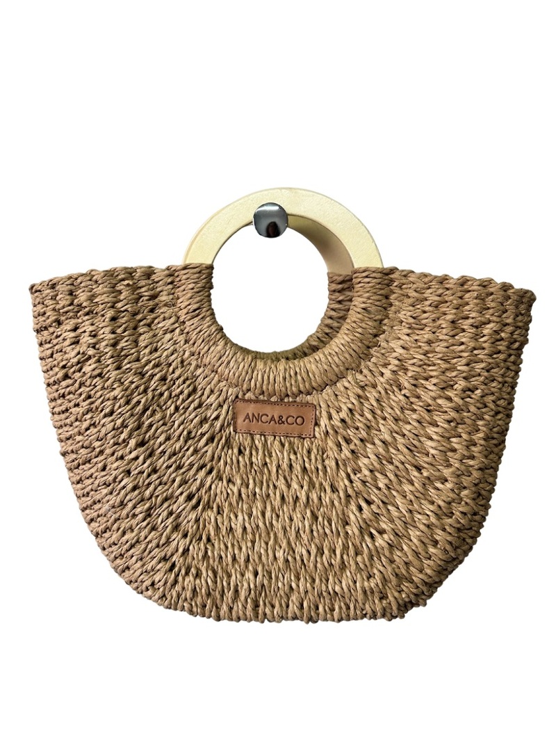 Cartera de mano ANCA&CO entrejido natural tipo rafia. Forrada, con manijas circulares rígidas entono claro. Medidas aprox: 24 x 34 cm.