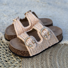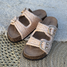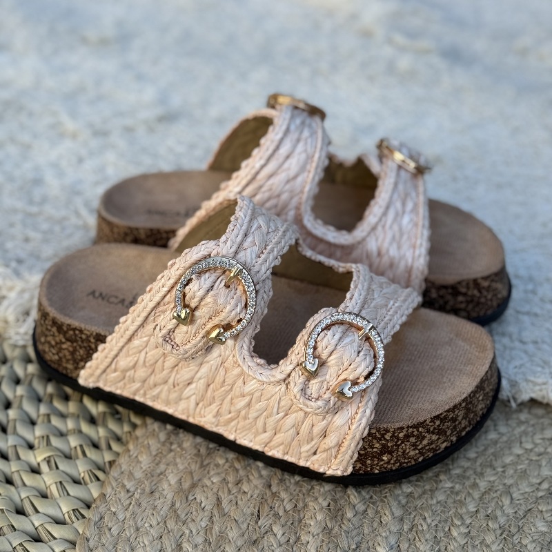 Zueco liviano con hebillas y rafia con base símil corcho