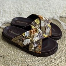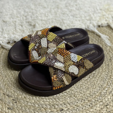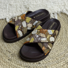 Zueco cruzado con piedras y canutillos, Horma amplia, Altura atras 3 cm y adelante 2 cm