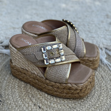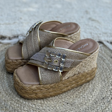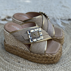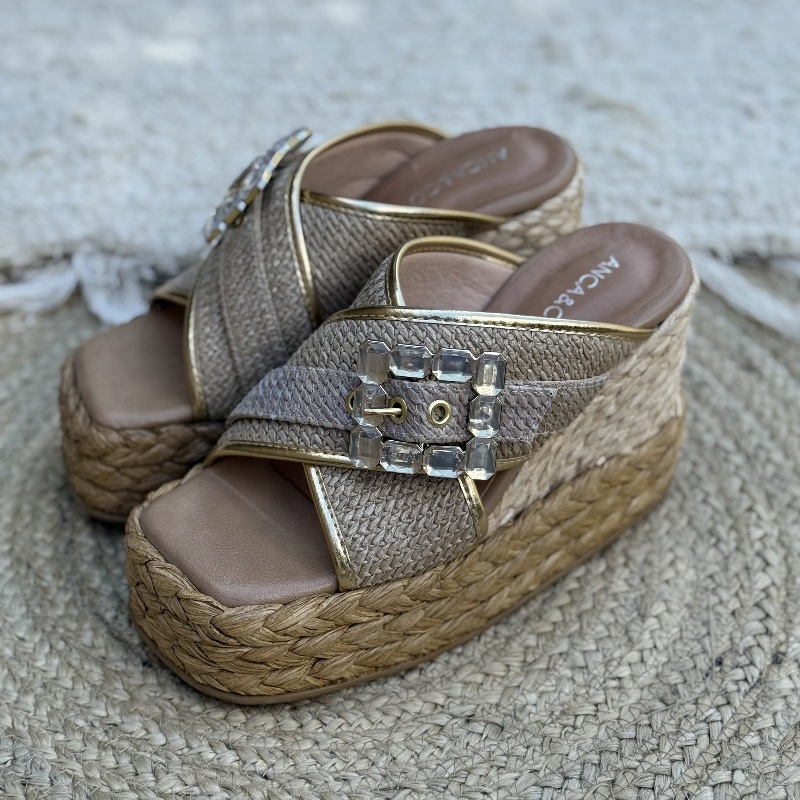 ZUECO CON BASE DE YUTE Y FAJA TEJIDA Y HEBILLA