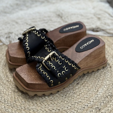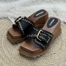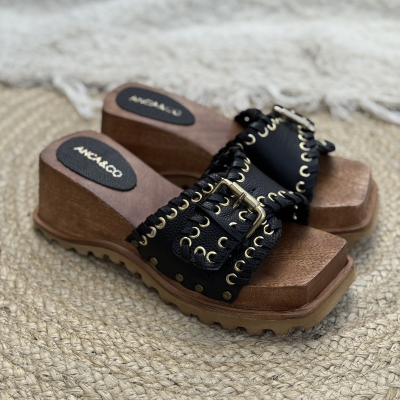 ZUECO CON HEBILLA Y FAJA CON PESPUNTE Y BASE DE MADERA LIVIANA